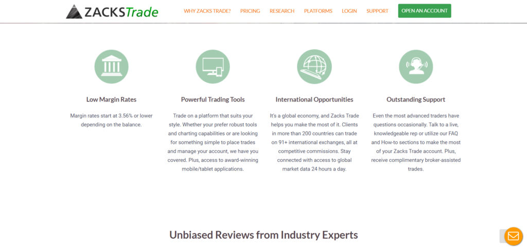 Zacks Trade offers a low margin rate i.e 3.56%. Sometimes even cheaper according to your balance. The platform is offering effective trading tools for everyone. International opportunities are another reason to choose Zacks Trade. Investors in 200+ countries are trading on more than 91 exchanges internationally, at low commission prices.