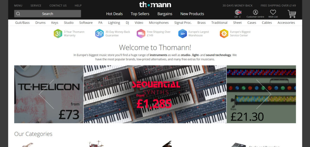 Thomann has a wide range of products from the categories including drums, guitars, keys, studio equipment, microphones, wind instruments, accessories and more.