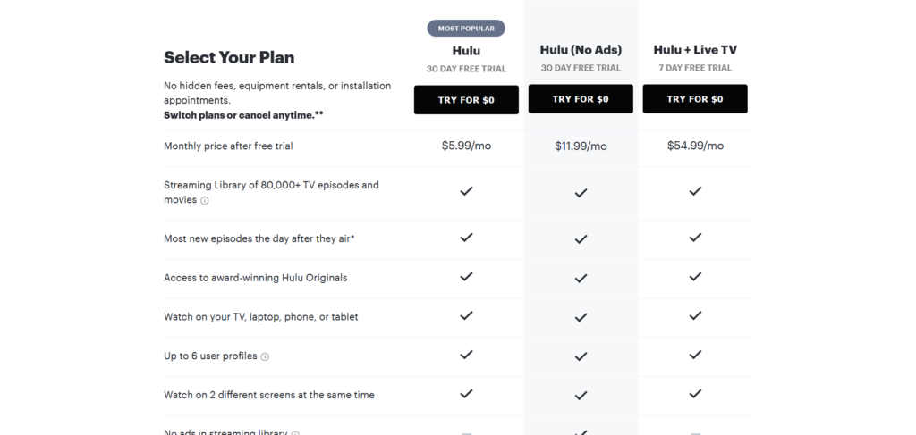 It is quite easy for users to enjoy streaming on Hulu. All you need to do is sign up for the app, choose a plan among three (Hulu, Hulu No Ads, Hulu + Live TV) and enjoy the free trial. You can enjoy 30 days of free trial for Hulu and Hulu (No Ads) whereas you can use Hulu + Live TV for only 7 days. You can pay for the actual plan after the trial period ends or cancel the plan any time.